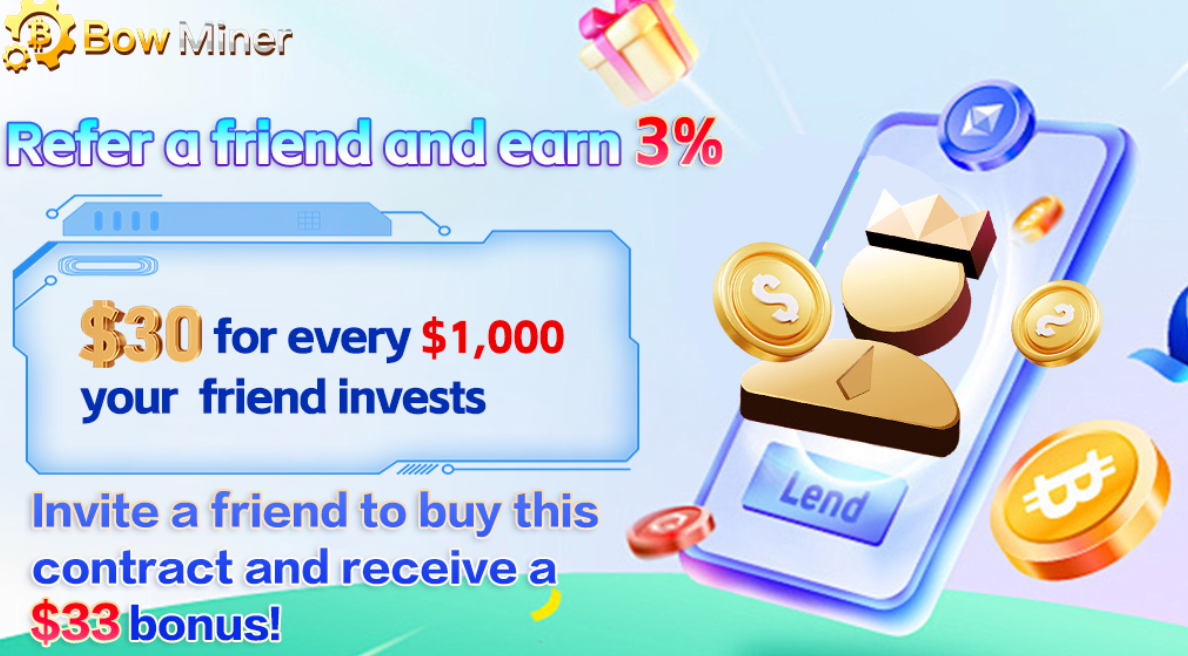 Bow Miner provides safe and reliable cryptocurrency cloud mining services, with top security guarantees such as McAfee® and Cloudflare® to ensure that your funds, information and income are stable and worry-free. Want to make money at zero cost? Invite friends through the affiliate program to get a permanent reward of 3% of their investment amount-for example, if a friend invests $1,000, you will immediately earn $30! Tired of market fluctuations? Our automated mining contracts allow you to easily turn on the “lazy man gets rich” mode: just register and select a contract, you can enjoy the income 24/7, with potential daily income of up to $100 to $1 million. Join Bow Miner now and experience the minimalist journey of getting rich from “register→wait→collect money”!